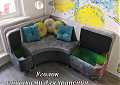 А здесь мы представляем вам реализованный проект - изготовление радиусного уголка под заказчика. Этот угловой диван для кухни на заказ был изготовлен под круглый обеденный стол. Выполнен кухонный уголок по индивидуальным размерам и по желанию заказчика укомплектован ящиками для хозяйственных нужд. Обивки выбраны износостойкие и легко очищаемые в домашних условиях от возможных загрязнений. Яркие декоративные подушечки прекрасно гармонируют с фотопечатью на стене кухни.