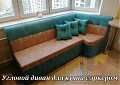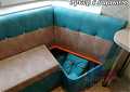 Здесь представлена работа фабрики Алина Мебель - изготовление нестандартного кухонного дивана для эркера. Полуэркерный угловой диван для кухни на заказ, выполненный по индивидуальным размерам нестандартного помещения в комплектации с ящиком для хранения и спальным местом. Спинки дивана по желанию заказчика украшают яркие стразы, обивка подобрана на контрасте - яркая бирюза прекрасно сочетается с нежным бежевым велюром.