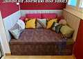 Выполнен встроенный диван на лоджию со спальным местом и выдвижным ящиком для белья. Изготовлен нестандартный диван по индивидуальным размерам лоджии и получился очень уютным и ярким, как того и хотели наши заказчики.