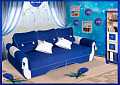 Диван для детской комнаты, который Вы видите ниже, был изготовлен специалистами мебельной фабрики Алина по индивидуальному проекту заказчика в выбранной им обивке и необходимых габаритов. Диван-кровать с механизмом трансформации Еврокнижка имеет комфортное ортопедическое спальное место и объемный ящик для постельных принадлежностей. Яркая цветовая гамма дивана, построенная на контрастном сочетании синего и белого цветов, гармонирует с корпусной мебелью и текстильным дизайном детской комнаты. Изогнутая форма подлокотников дивана, а также декоративный кант и пушистые кисти, подобранные в тон обивке, добавляют определенную изюминку данному проекту.