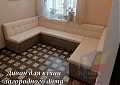 Изготовление П-образного дивана под заказ - заказчицей на свой вкус выбраны износостойкие и легко очищаемые от загрязнений микровелюровые ткани цвета беж и по-темнее коричневого тона, гармонично сочетающихся с общим стилем кухни. Декоративные подушечки со стразиками в подарок прекрасно дополняют диван и отлично смотрятся в интерьере.