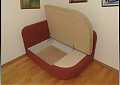 Габариты тахты - 1м 60см х 2м с ровным спальным местом на пенополиуретане, габариты кресла - 70см х 1м. По желанию заказчика тахта укомплектована множеством декоративных подушек разных размеров со съемными чехлами на молнии. Тахта и кресло оснащены ящиками для постельных принадлежностей, открывающихся при помощи подъемных механизмов. Яркие тона мебельной обивки, со вкусом подобранной заказчиком, удачно сочетаются с общим стилем гостиной.