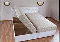 Изготовление кровати для спальни, представленной здесь, было выполнено по индивидуальному проекту частного лица. Кровать выполнена по типу тахты с применением метода каретной стяжки стразами, укомплектована двумя разделенными ящиками для постельных принадлежностей с подъемным механизмом. В основе спального места размером 2м х 2м внутренним наполнением служат ортопедические независимые пружины. Со вкусом под стиль спальни подобраны и обивочные материалы - шенилл и экологичная кожа, а стразы на спинке кровати придают изделию эстетический вид.