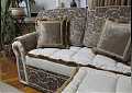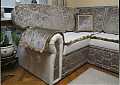 Здесь представлен мягкий угловой диван для гостиной, изготовленный на заказ с механизмом трансформации спального места "Дельфин" и укомплектованный ящиком для постельных принадлежностей. Изысканное сочетание обивочных материалов - флока и шелкография выбранного заказчиком шенилла - дополняют золотистый декоративный кант, пушистые щетки и кисти, а также мягкие декорированные подушечки, тем самым создают эффектный внешний вид, подчеркивая классический стиль данного дивана.
