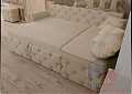 Изготовлен нестандартный угловой диван по размерам заказчика. Для наполнителя сидений и спинок применяется высокоэластичный ППУ. Спинку и царги дивана украшает каретная стяжка пуговицами, мягкие фигурные подлокотники - с декоративными кистями и отделкой золотистым кантом. Декоративные подушки являются стильным акцентом интерьера.